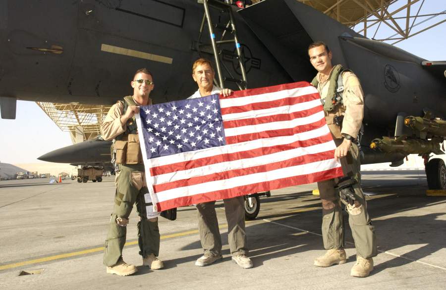 F-15 Strike Eagle Pilot Capt "Ritz" & Weapons Systems Officer Capt "Amp" give Flag to Marko after mission over Iraq on 5 Dec 2005