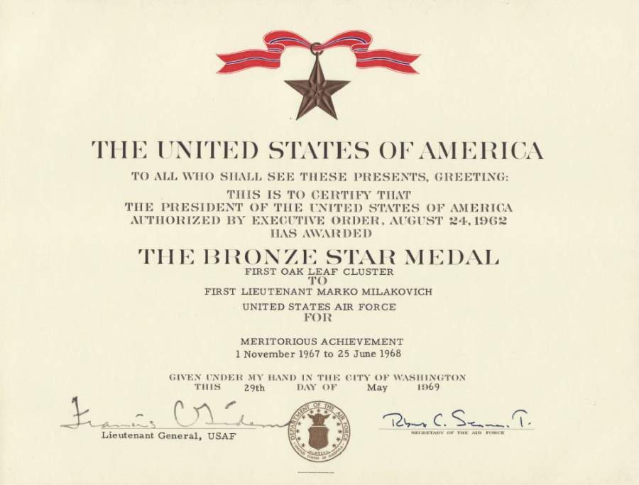 Second of two Bronze Stars Marko received while in the First Mobile Comm Group for duty in Vietnam.